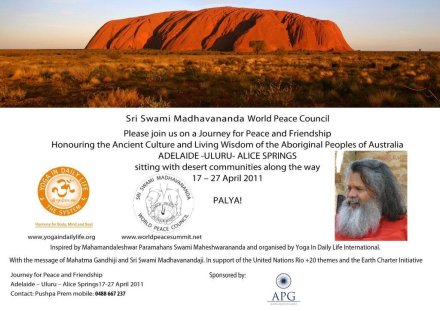 The seeds for the Sri Swami Madhavananda World Peace Council : Project for Reconciliation - Journey for Peace and Friendship Honouring the Ancient Culture and Living Wisdom of the Aboriginal Peoples of Australia April 17-27, 2011 were sown by Paramahans Swami Maheshwarananda in April 1995 more than 15 years ago in Queensland, Australia.